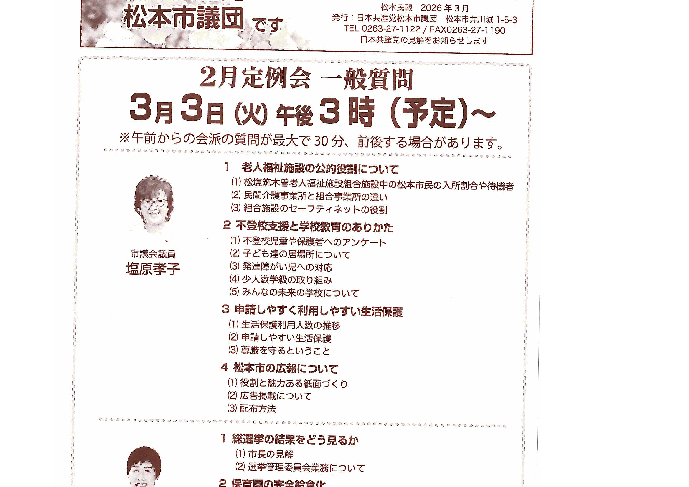 松本市会議員 塩原たか子 ホームページにようこそ 高市政権の危険性がより一層強まりました。 市民との共闘強め、戦争への道をともに阻止しましょう。 みなさんのご意見お寄せください。 日本共産党のホームページへ あったか通信最新号 28号が出来上がりました。ご意見をお願いします。 あったか通信 最新号 28号 上のボタンを押すとすべてのページがご覧できます。下記にバックナンバーをつけました。クイックしてご覧ください。ご意見もよろしくお願いします。 あったか通信27号 あったか通信26号 あったか通信25号 あったか通信24号 あったか通信23号 あったか通信22号 あったか通信21号 あったか通信20号 明日は2月定例会一般質問です。傍聴ください。