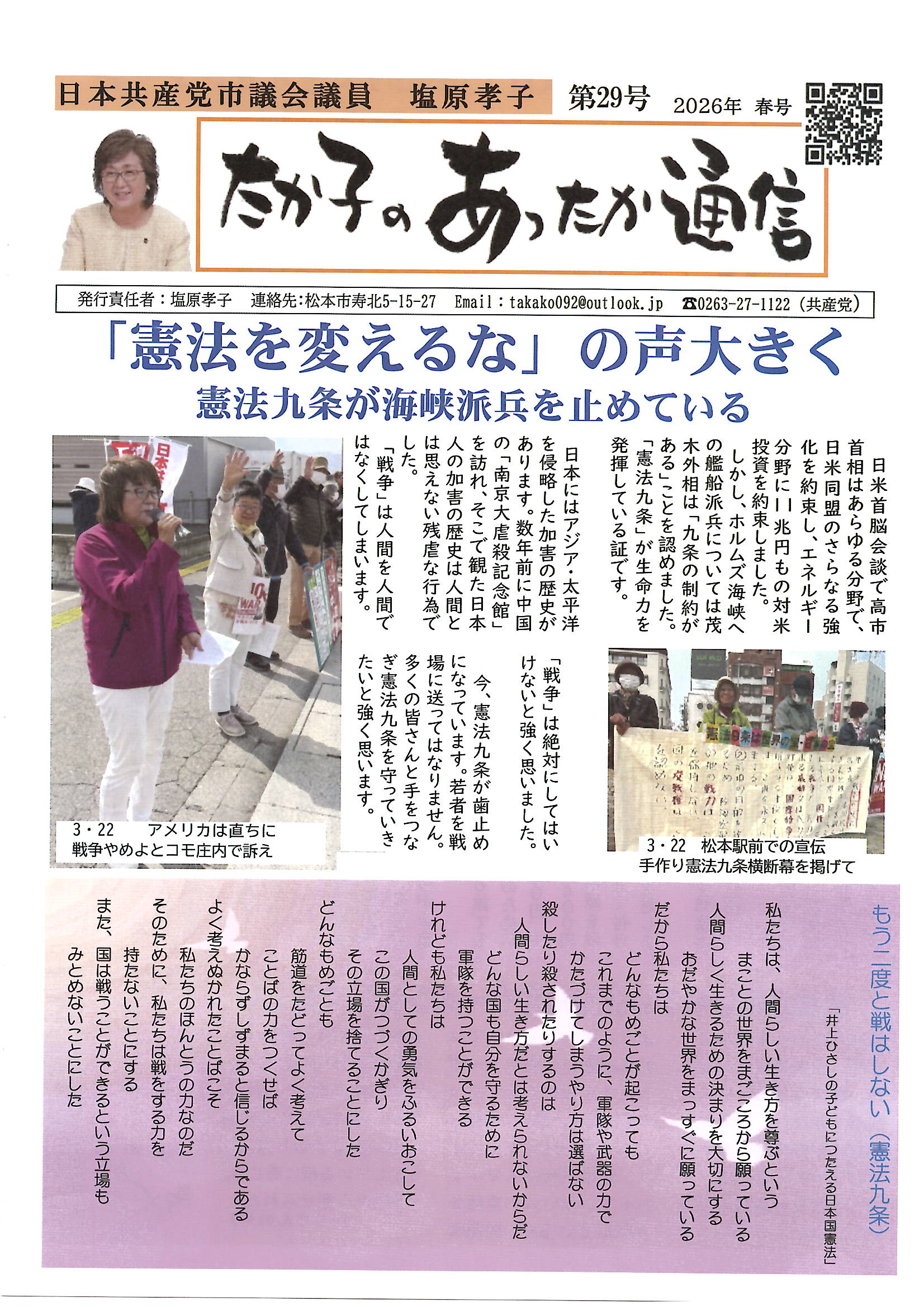 松本市会議員 塩原たか子 ホームページにようこそ 高市政権の危険性がより一層強まりました。 市民との共闘強め、戦争への道をともに阻止しましょう。 みなさんのご意見お寄せください。 日本共産党のホームページへ あったか通信最新号 29号が出来上がりました。ご意見をお願いします。 あったか通信最新号29号 上記のボタンをクイックすると4面全部がみられます。 あったか通信28号 あったか通信27号 あったか通信26号 あったか通信25号 あったか通信24号