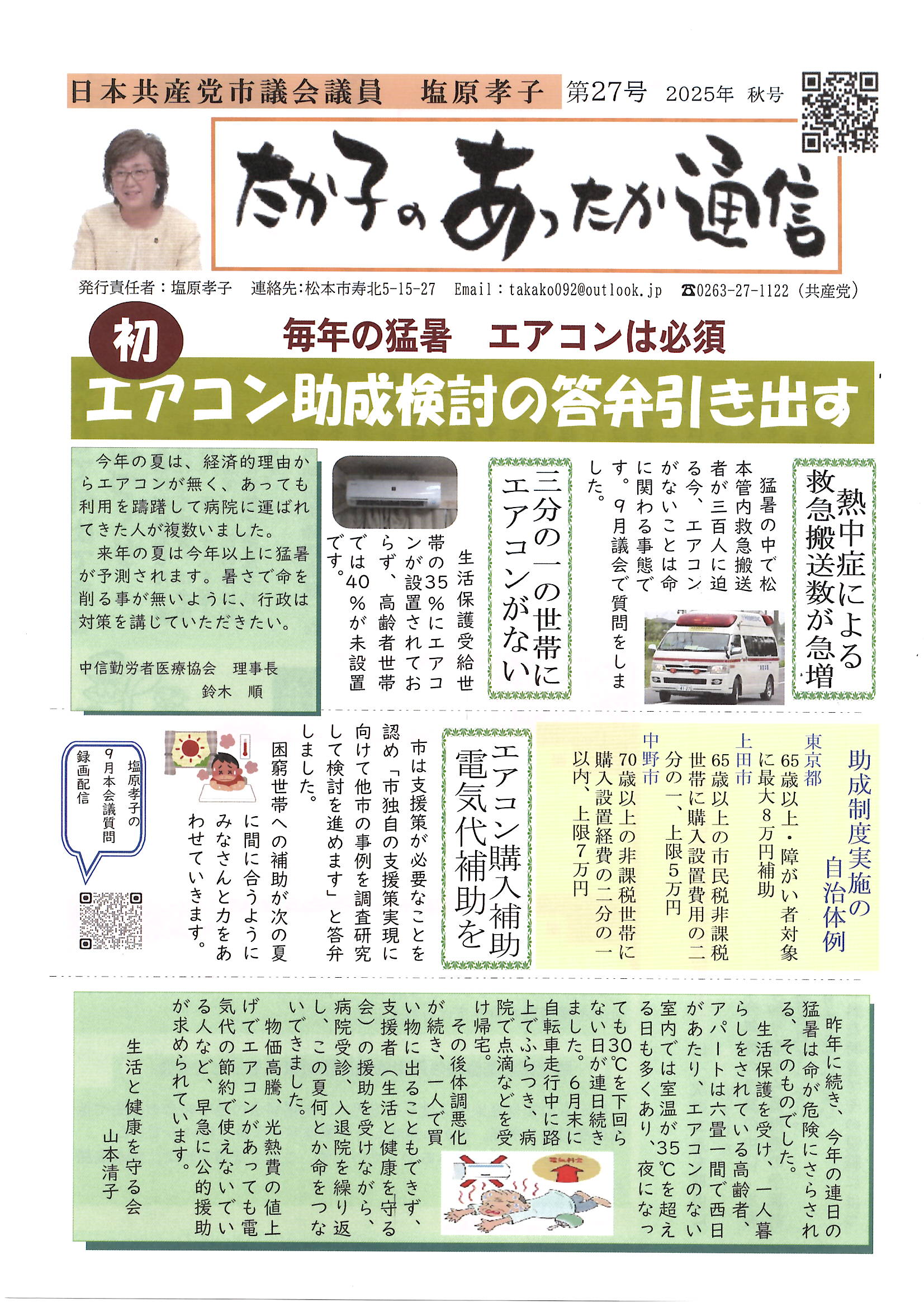 松本市会議員 塩原たか子 ホームページにようこそ 高市政権の危険性がはっきりしてきました。戦争への道をともに阻止しましょう。 日本共産党のホームページへ あったか通信最新号 27号が出来上がりました。ご意見をお願いします。 あったか通信 最新号が出来上がりました。 あったか通信 最新号 完成 27号 上のボタンを押すとすべてのページがご覧できます。 下記にバックナンバーをつけました。クイックしてご覧ください。 あったか通信26号 あったか通信24号 あったか通信25号 あったか通信23号 あったか通信22号 あったか通信21号 あったか通信20号